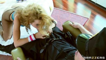 Блондинка должна была выселиться из этого дома за долги, но ей некуда было идти и она продолжала тут жить. А сегодня даже полицейский пришел для того, чтобы ее выселить. Но светловолосая девица смогла его уговорить пока этого не делать и дать ей хотя бы несколько денечков тут пожить. Просто когда она полезла к нему в штаны и начала минет делать, то полицейский так кайфовал, что был готов на все ради этой блондинки. Светловолосая молодая сучка после отсоса и письку подставила, чтобы потрахаться.